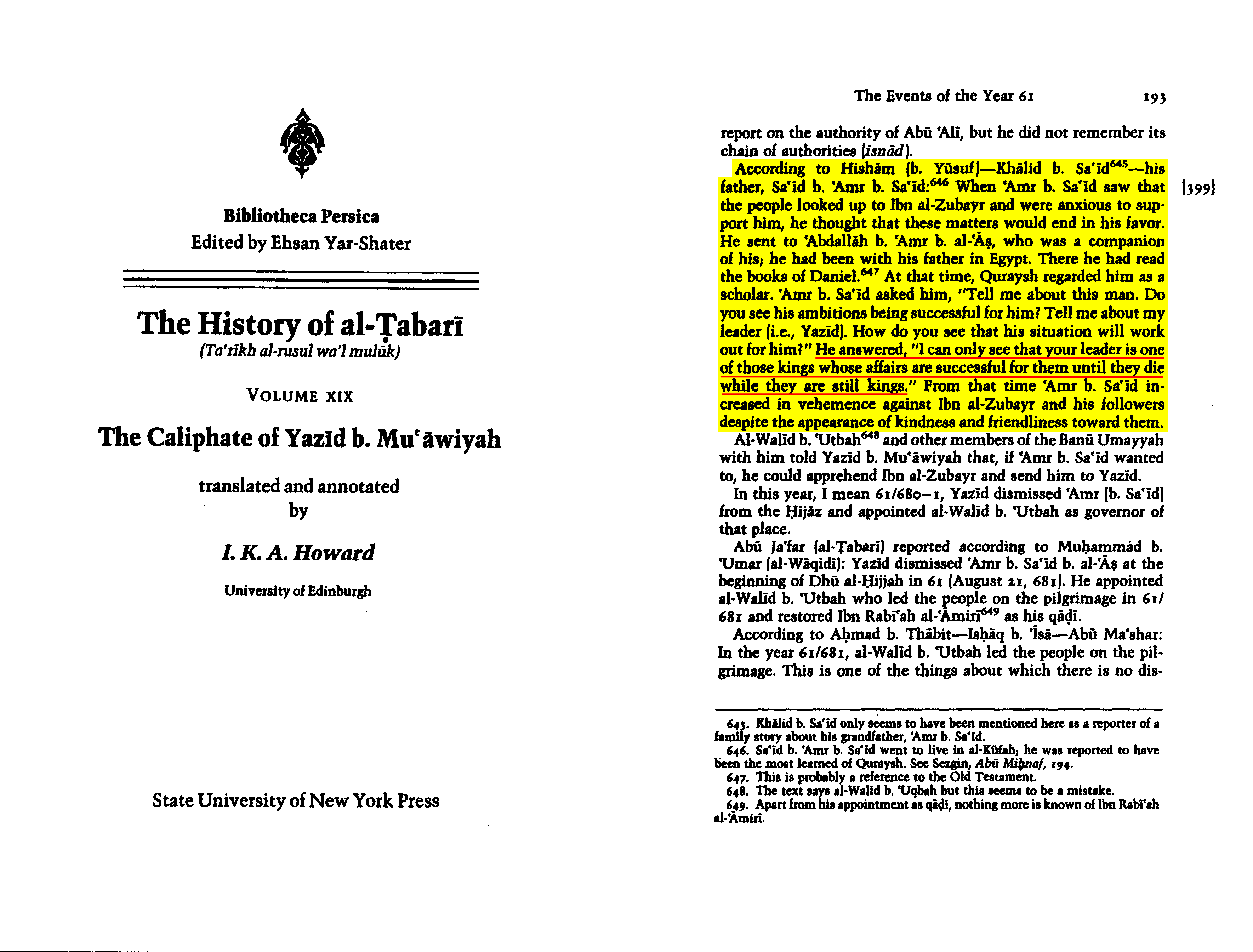 When Amr b. Sa'id saw that the people looked up to Ibn al-Zubayr and were anxious to su port him, he thought that these matters would end in his favor. He sent to 'Abdallah b. Amr b. al-'Aş, who was a companion of his; he had been with his father in Egypt. There he had read the books of Daniel. At that time, Quraysh regarded him as a scholar.