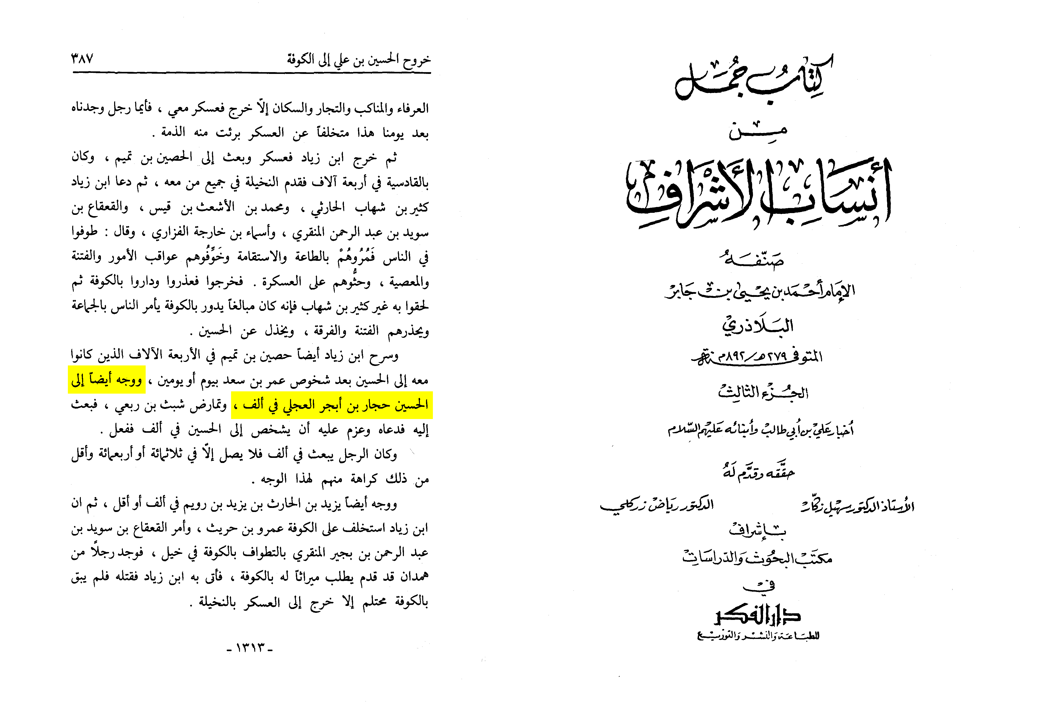 He (‘Ubayd Allah b. Ziyad) also sent against Husayn Hajjar b. Abjar al-Ajli with one thousand (men).