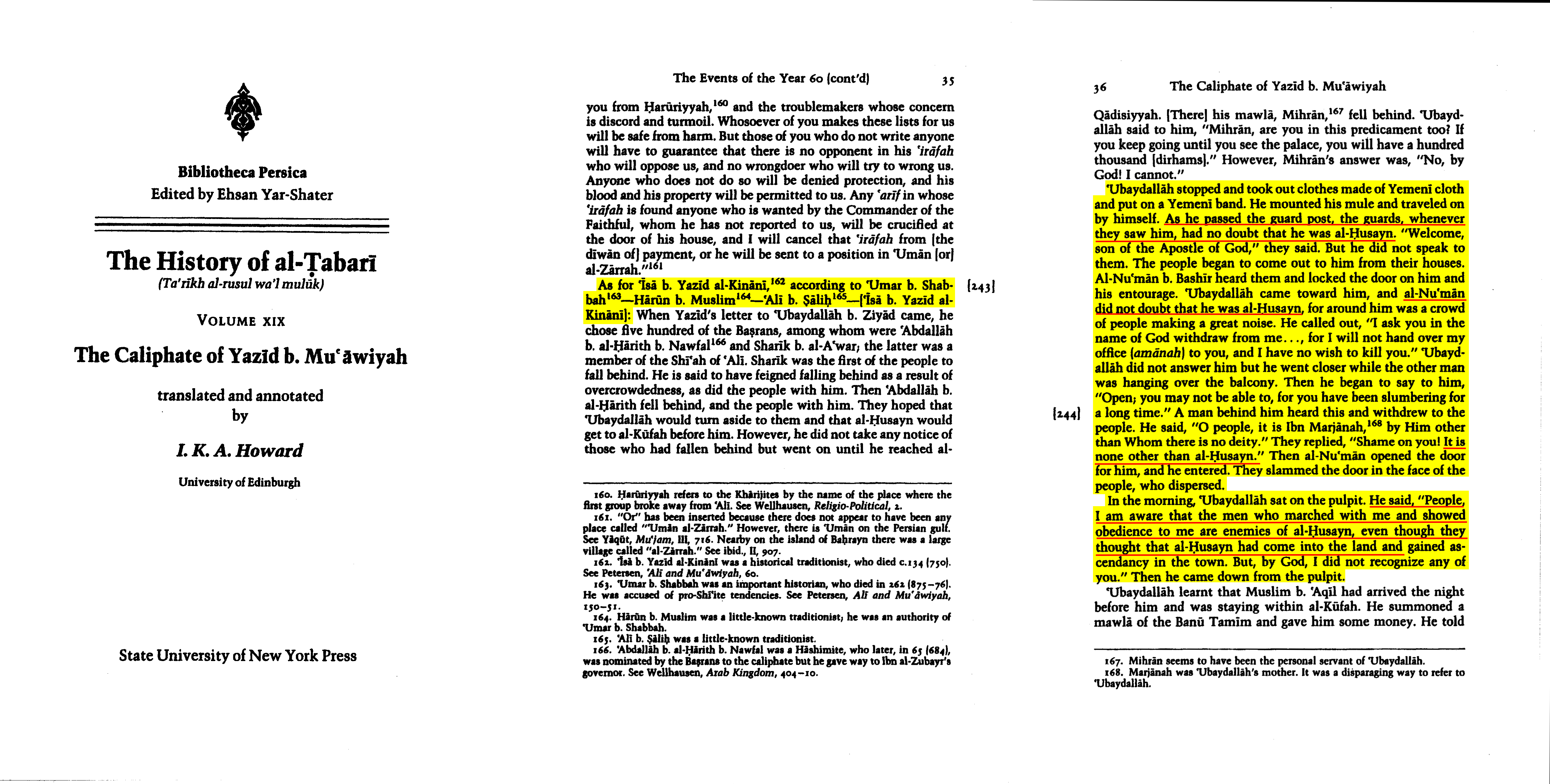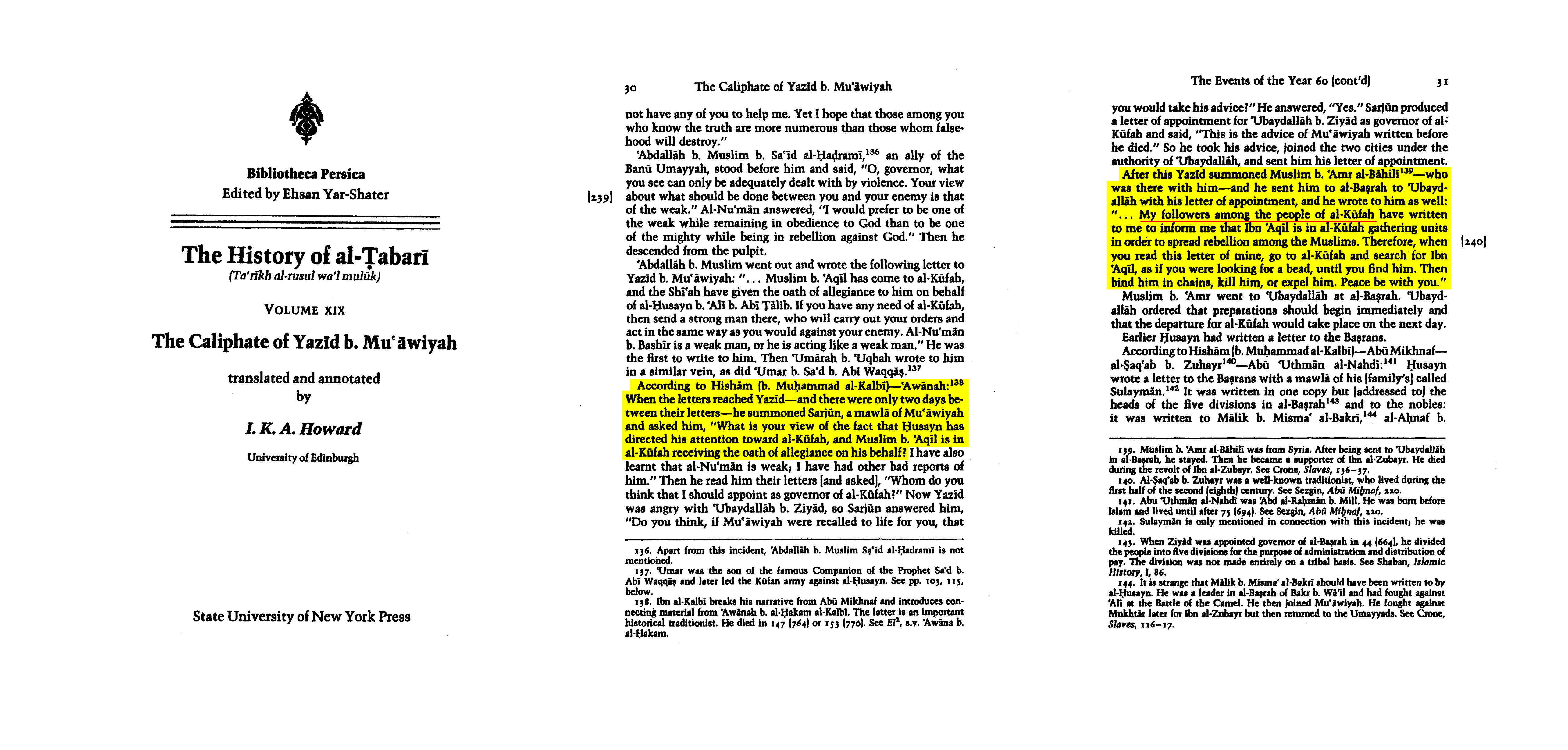 Her son was a mawla of Muhammad b. al-Ash'ath. When the boy recognized him, he went to Muhammad and told him. Muhammad went to 'Ubaydallah and told him. 'Ubaydallah sent 'Amr b. Hurayth, the commander of his police, to get him. With him went 'Abd al-Rahman b. Muhammad b. al-Ash'ath.95 Muslim was not aware of what was happening until the house was surrounded. When he realized, he went out against them with his sword and fought them. Abd al-Rahman gave him a guarantee of safe-conduct and thus got him into his power. He brought him to Ubaydallah.