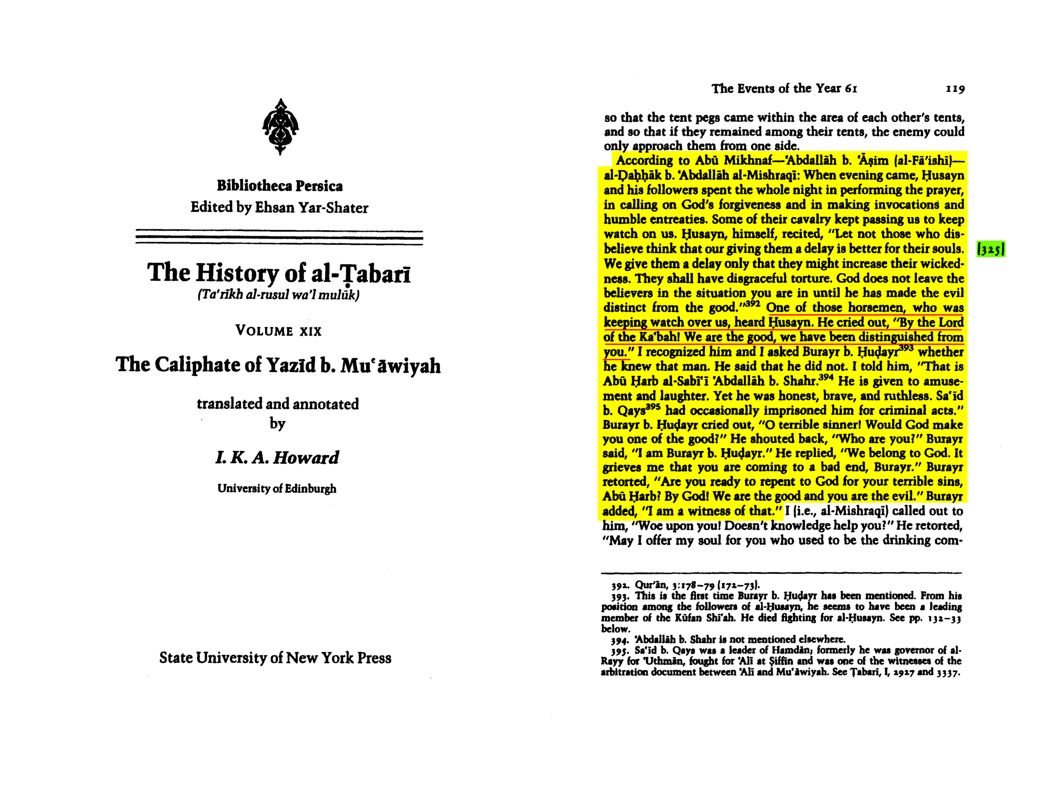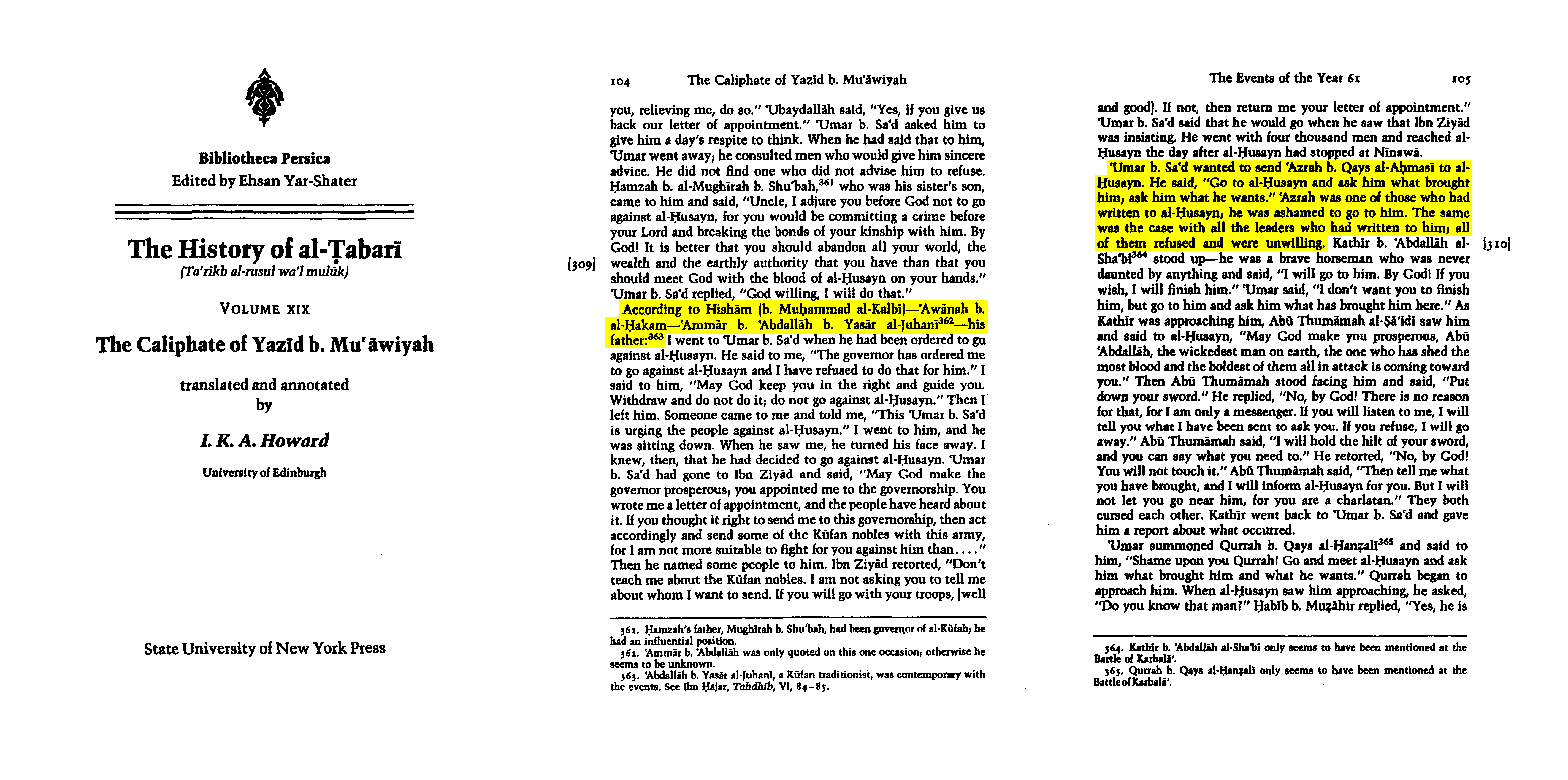 He (Ibn ziyad) gave similar instructions to al-Qaqa' b. Shawr al-Dhuhli, Shabath b. Rib'i al-Tamimi, Hajjar b. Abjar al-Ijlī' and Shamir b. Dhī al-Jawshan al-'Amiri.