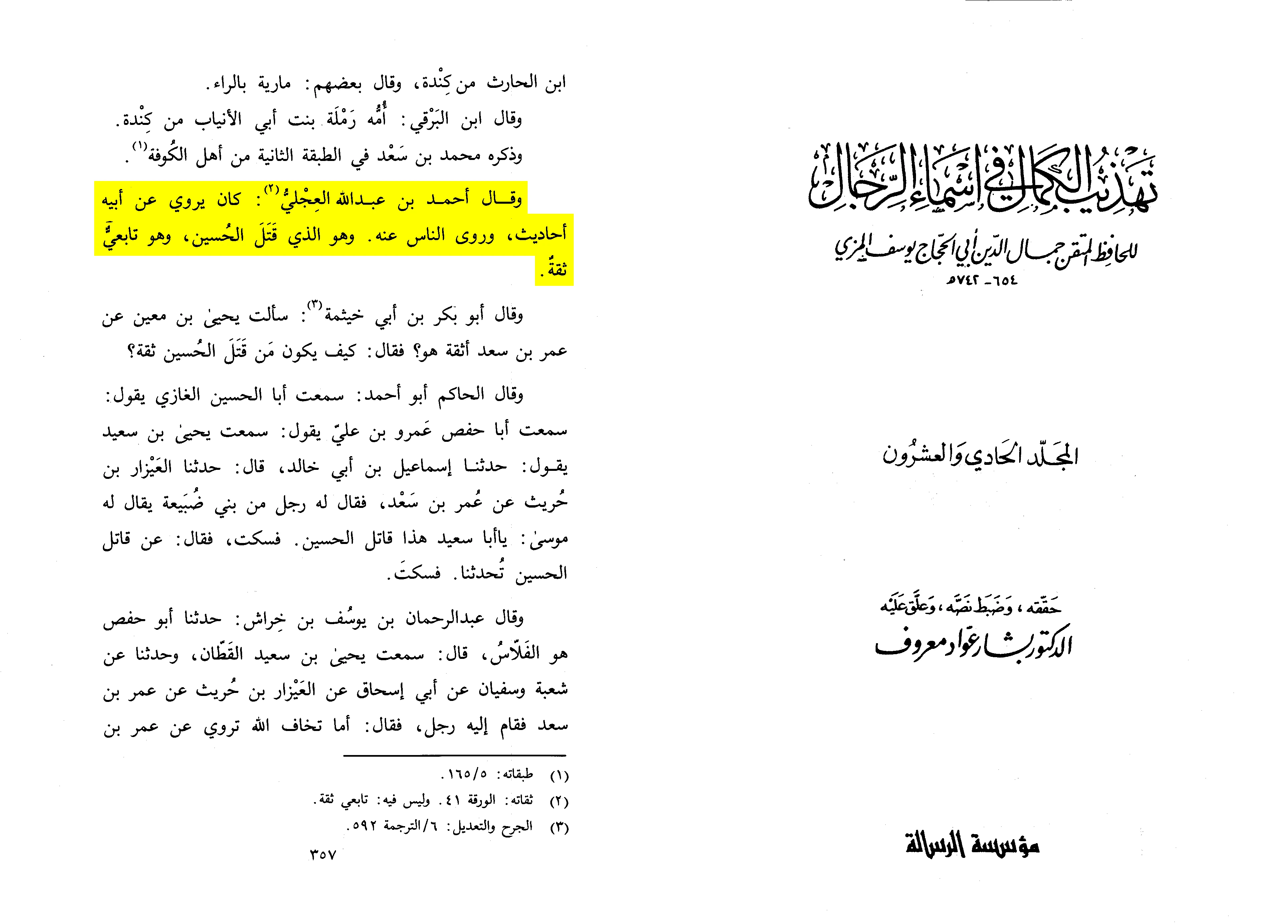 Despite this, being the head of the ones that marched towards the martyrdom of the Master of the Youth of Paradise, the Grandson of the Holy Prophet (saw), what does al-Dhahabi say regarding his character or status of narrating hadith? Well he writes in his Mizan al-I'tidal, vol. 5. pg. 238 - 239, bio. 6122: