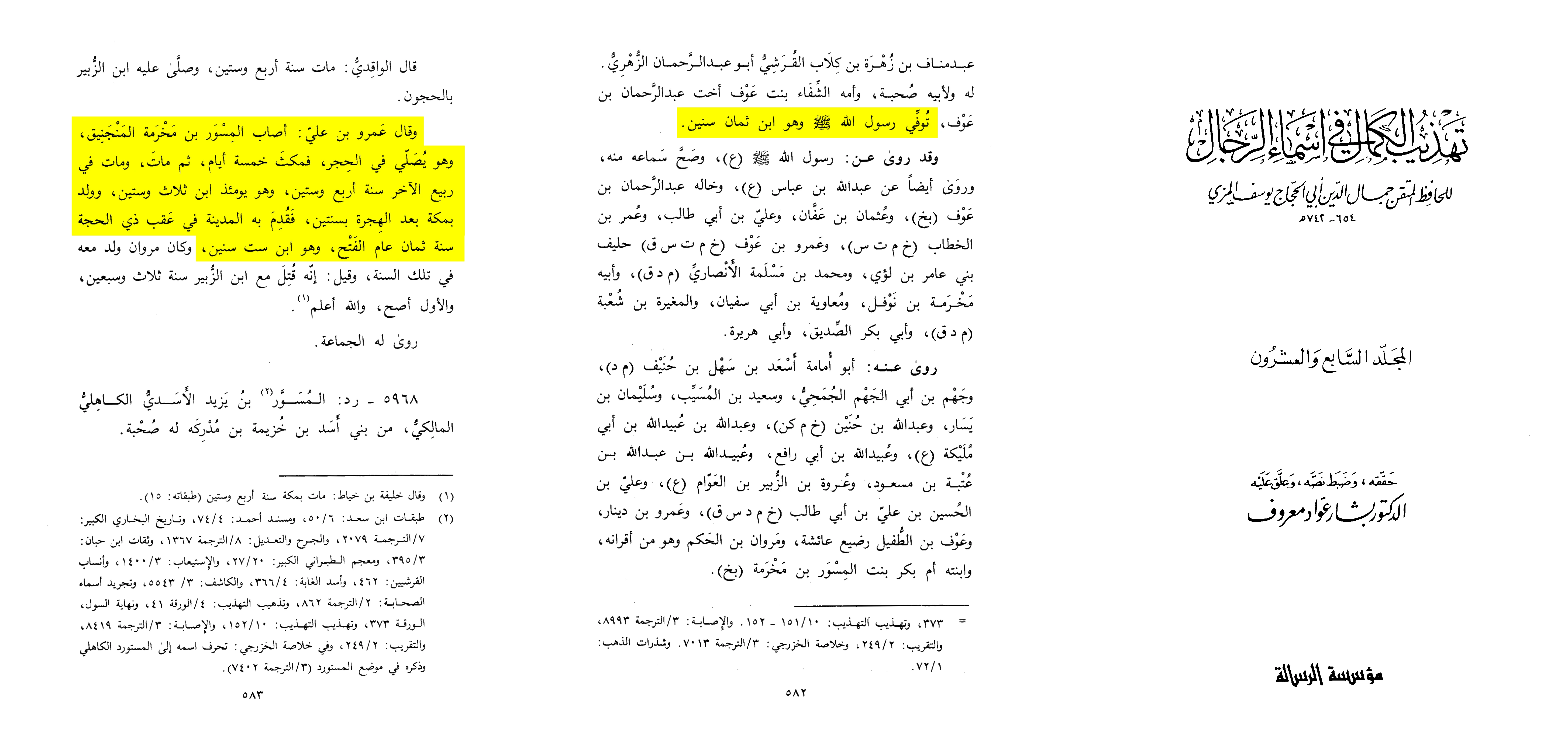 Miswar however could not have done so because he was born in 2 AH meaning he would’ve been 6 years old when reporting this narration, and none of the scholars of Ahlus Sunnah disagree on that point. Just refer to al-Tahdhib al-Kamal, vol. 27, pg. 582 by al-Mizzi and al-Tahdhib al-Tahdhib, Vol. 4, pg. 79 - 80 by Ibn Hajar al-’Asqalani where he says: