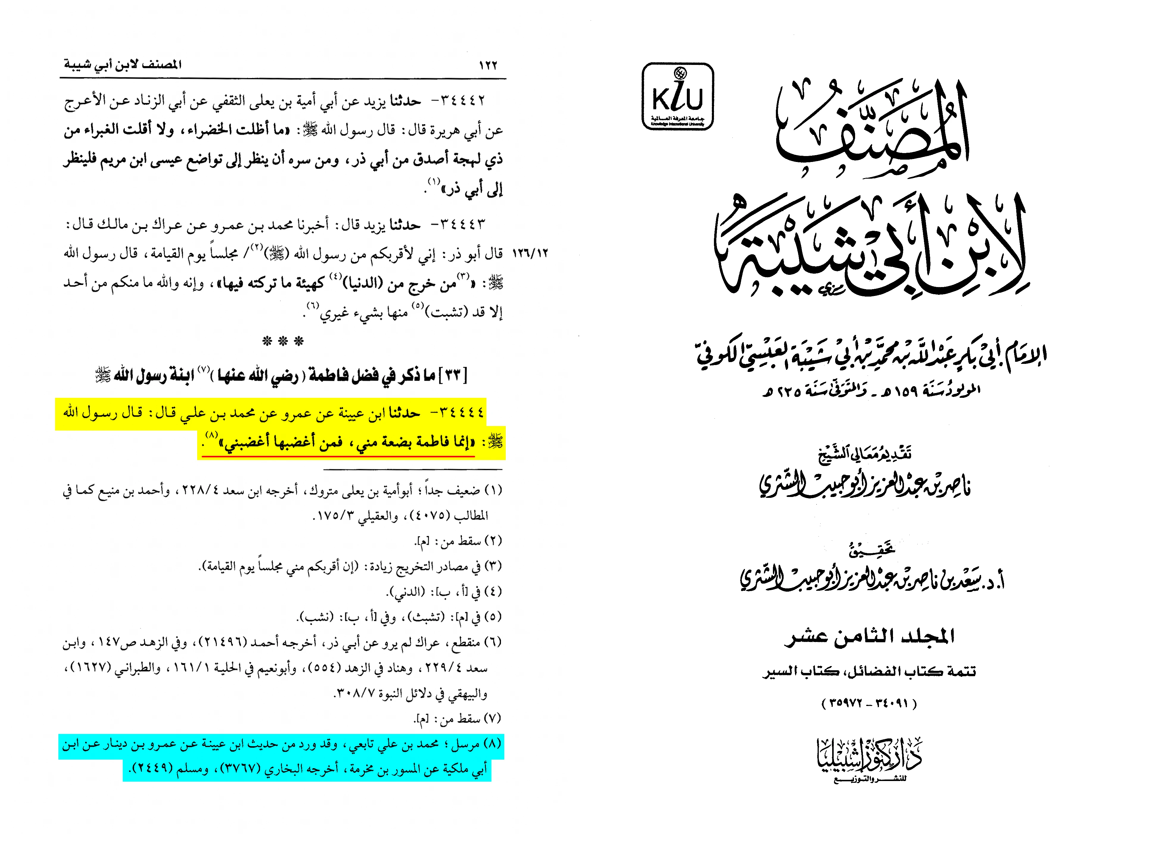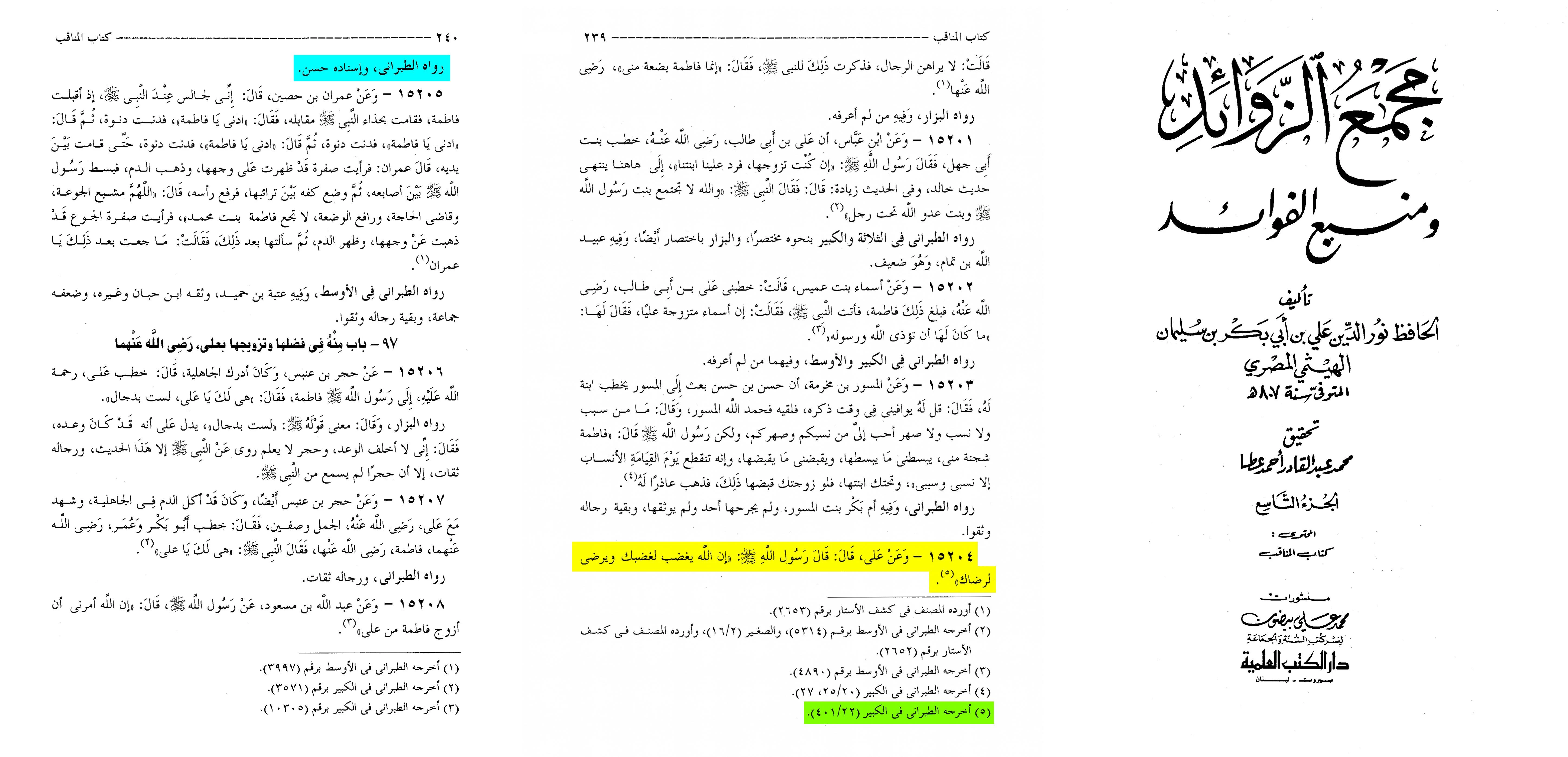 This hadith passed in the book of Fardh Al-Khums and in Manaqib through Al-Zuhri from Ali ibn Al-Hussain ibn Ali (.s) from Al-Miswar, and he adds the story of the sword of the Prophet (saw) in it and that is the reason why Al-Miswar narrates him this hadith. And I mentioned whatever belongs to the story of the sword there. And my amazement does not stop from Al-Miswar how he exaggerates in his fanaticism towards Ali ibn Al-Hussain (as), he even says: "By Allah (swt)! If you give it to me, they will never be able to take it till I die" considering he was the son of Fatima (sa), and he uses that hadith mentioned in that chapter (i.e. Ali wanting to marry the daughter of Abi Jahl) and he does not consider to not bother him, because the obvious form of the hadith shows that he mocks Ali ibn Al-Hussain (as) by degrading his grandfather Ali ibn Abi Talib (as), when he proposed to the daughter of Abi Jahl over Fatima (sa), until it ended up that the Prophet (saw) disliked it. And what amazes me more than the first one about Al-Miswar is that he claims to be ready to die to protect the sword because of the children of Fatima (sa), but he does not put forward his life for Al-Hussain (as) himself, father of Ali (as) with whom this story happened until he (i.e. Al-Miswar) was killed by the hands of tyrant rulers. But his excuse could be that when Al-Hussain (as) left towards Iraq, Al-Miswar and other people of Hijaz thought that his affairs would end up in what he likes. Allah (swt) knows best.