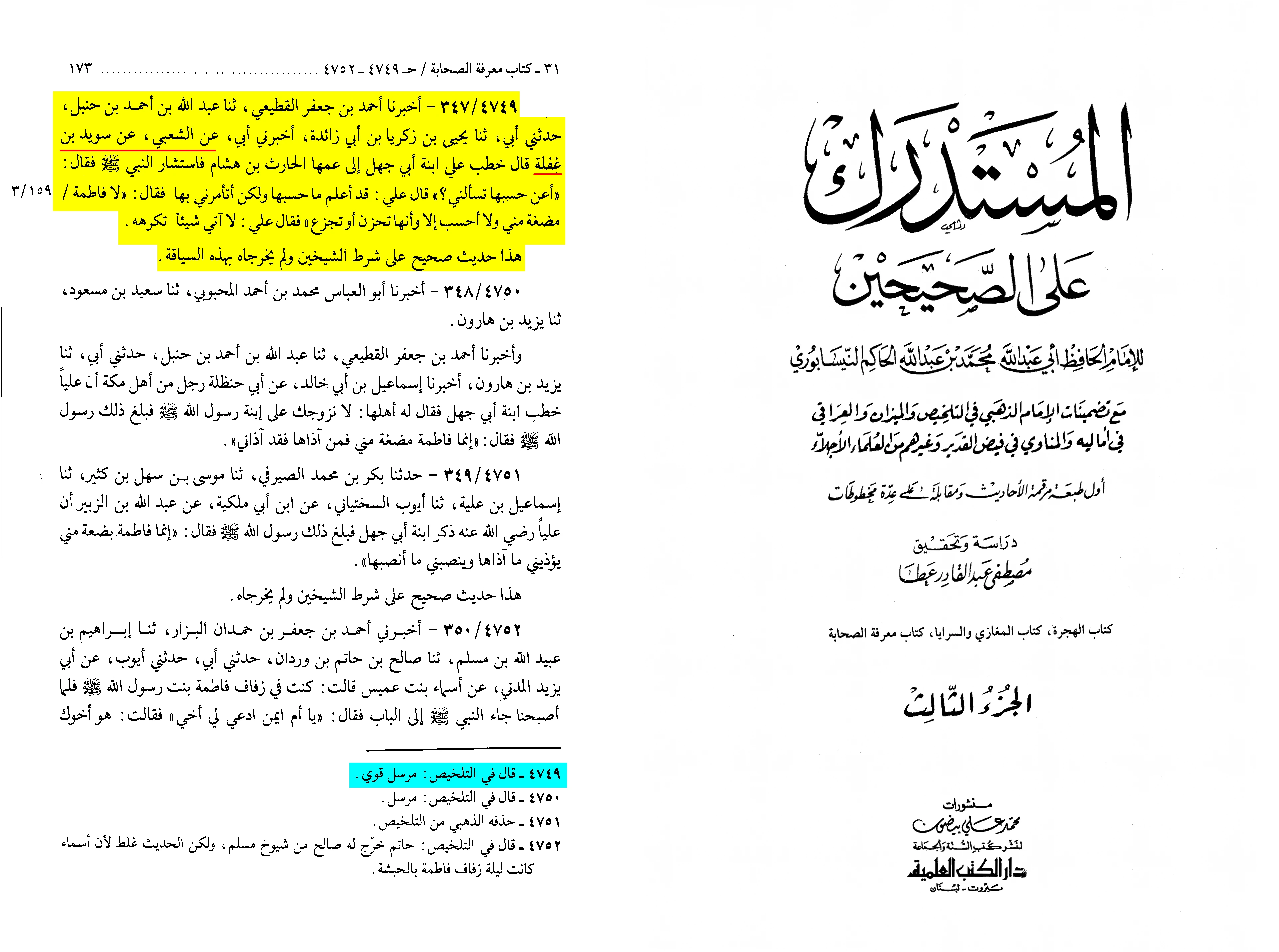 His narration can be read from al-Hakim’s Mustadrak ‘ala al-Sahihayn, Vol. 2, pg. 173. As al-Dhahabi points out however, the chain is مرسل قوي meaning ‘strong (but) disconnected ’. The disconnection in this chain comes from Suwayd himself, because he never met the Holy Prophet (saw). This can be attested by all books of rijal such as in Ibn Hajar al-’Asqalani’s al-Isti’ab, pg. 318 where he says he never met the Prophet (saw). It’s likely he got this report from Miswar and we will see why it’s likely.