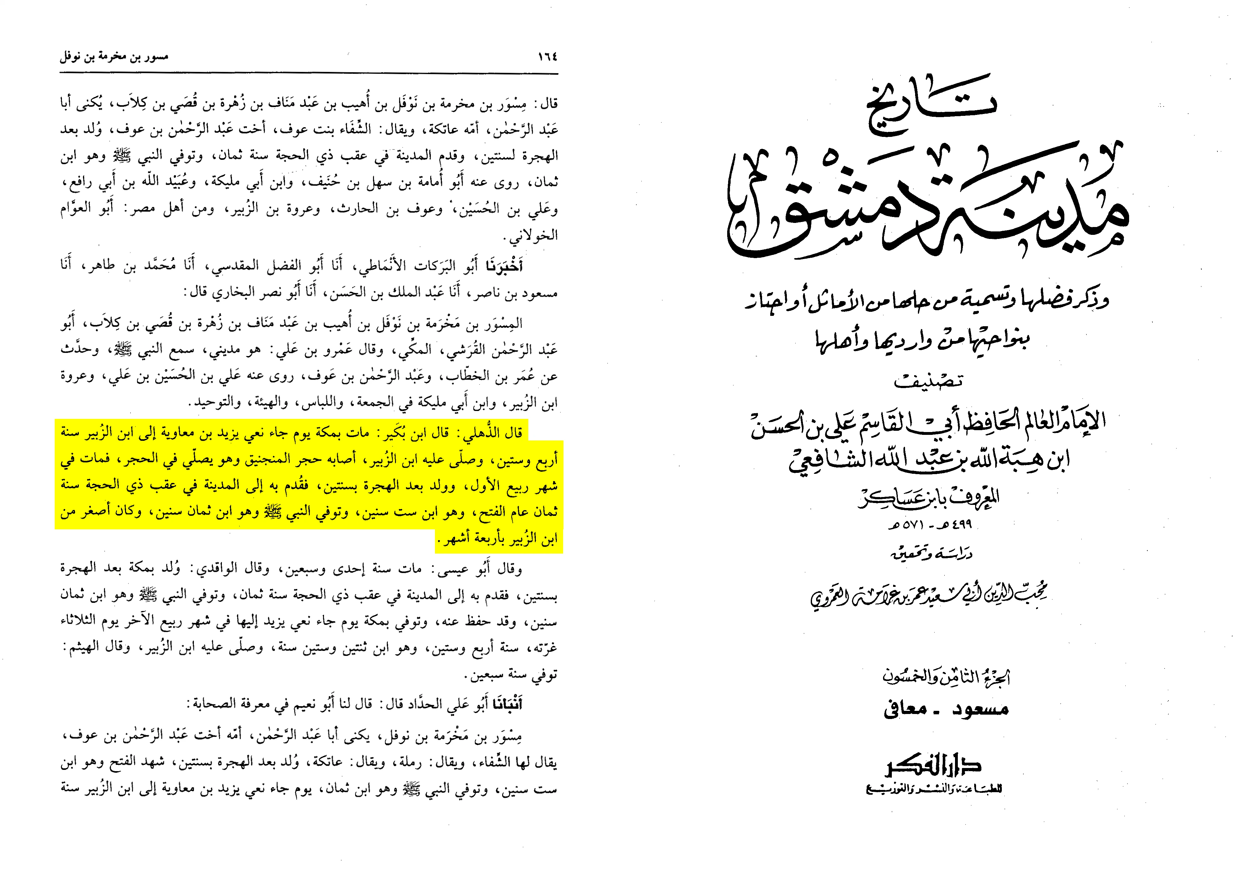 Ibn Zubayr’s report however holds the same problem as Miswar’s report, because they were the same age as Tarikh Ibn Asakir, Vol. 58, pg. 164 records that Miswar was only 4 months younger than Ibn Zubayr.