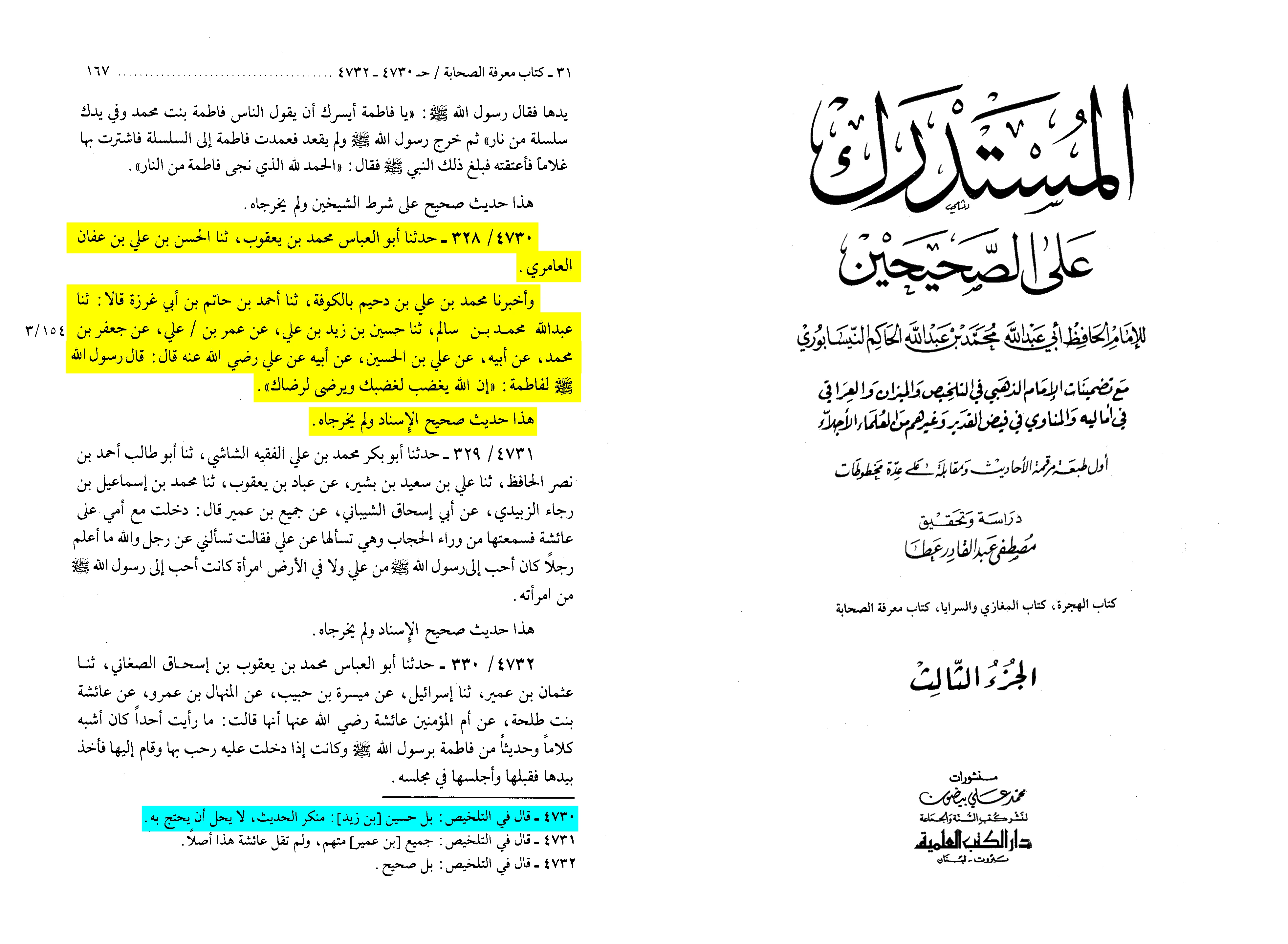 This hadith has also been recorded with another chain in Mustadrak al-Hakim, Vol. 3, pg. 168, but al-Dhahabi took issue with al-Hasan Ibn Zayd, a disciple of Imam al-Sadiq (as) known to narrate fadhail of Ahlulbayt (as) hence making sense as to why al-Dhahabi rejected him.