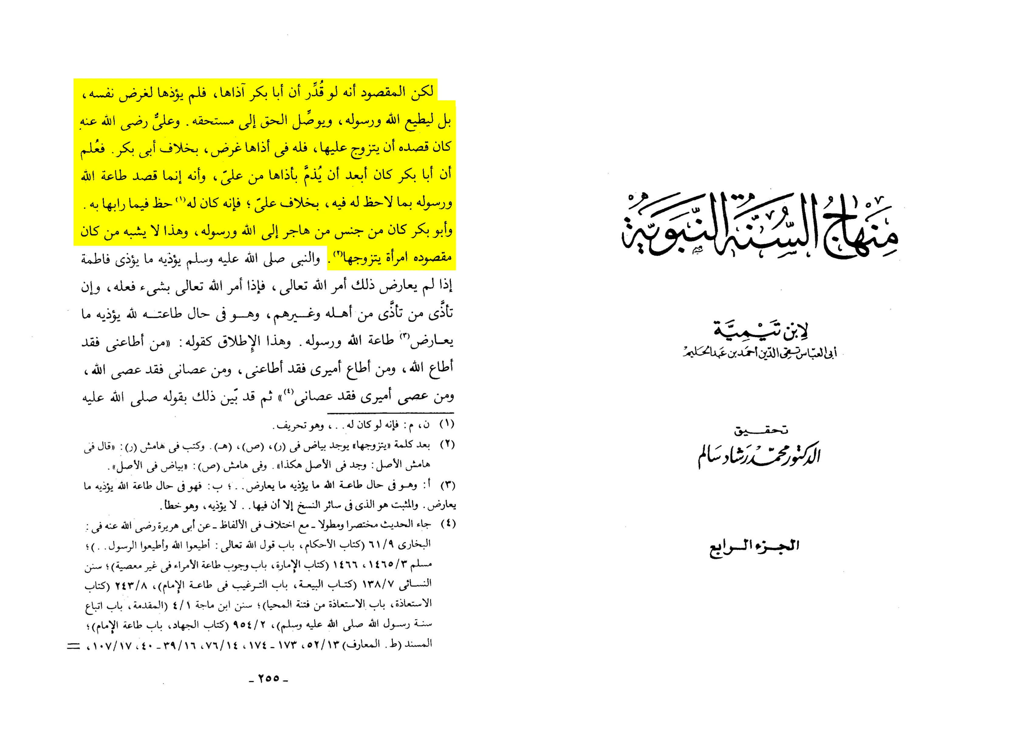 لكن المقصود أنه لو قُدّر أن أبا بكر ،آذاها، فلم يؤذها لغرض نفسه، بل ليطيع الله ورسوله، ويوصل الحق إلى مستحقه . وعلى رضى الله عنه كان قصده أن يتزوج عليها ، فله فى أذاها ،غرض، بخلاف أبي بكر. فعلم أن أبا بكر كان أبعد أن يُذم بأذاها من على ، وأنه إنما قصد طاعة الله ورسوله بما لاحظ له فيه ، بخلاف على ؛ فإنه كان له حظ فيما رابها به . وأبو بكر كان من جنس من هاجر إلى الله ورسوله ، وهذا لا يشبه من كان مقصوده امرأة يتزوجها