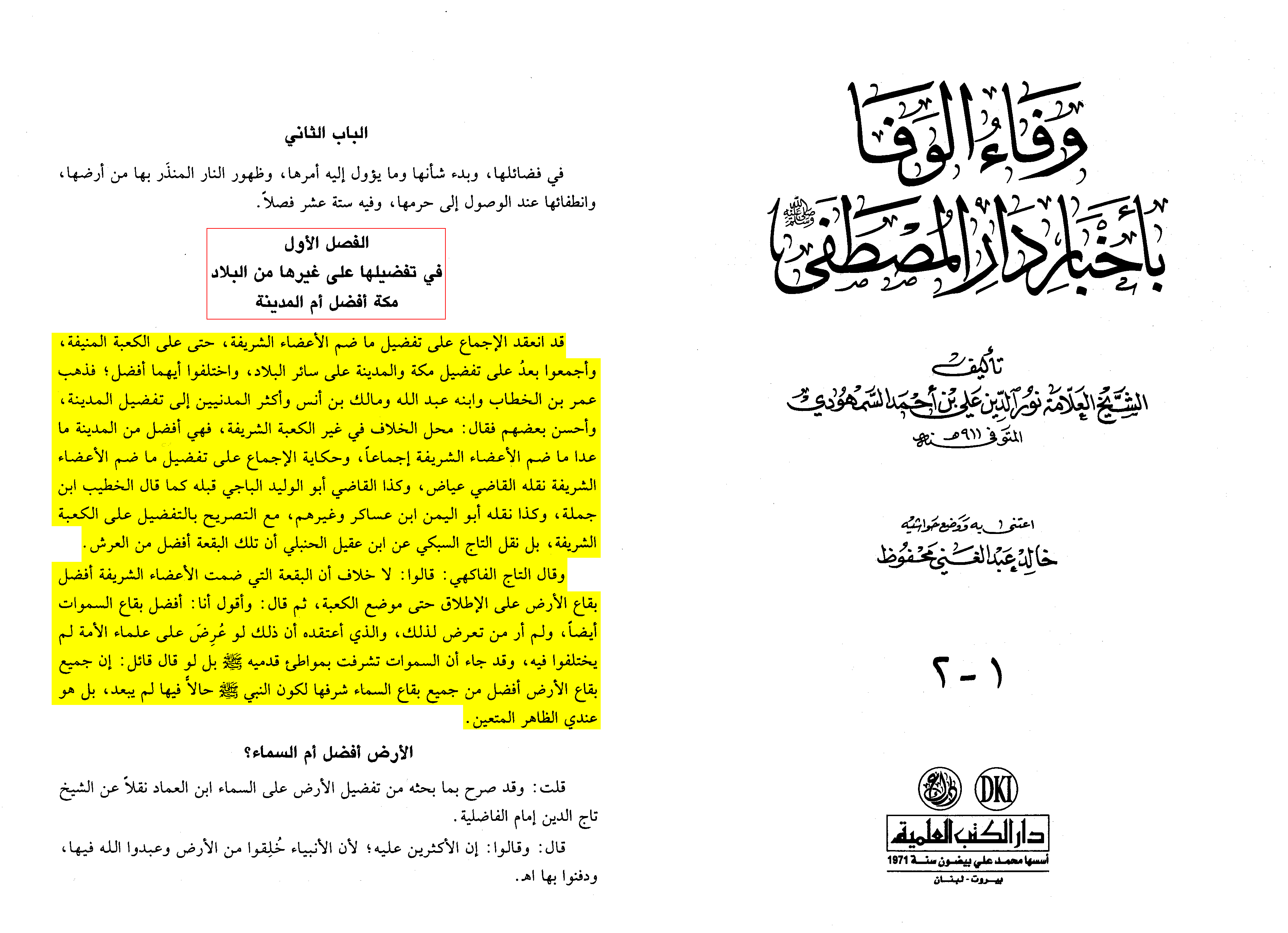 So it is indisputable that some lands have greater virtue than others. It has also been mentioned by numerous Sunni scholars, that the land of Medina is greater than the land of Mecca by virtue of the grave of Rasulullah (SAW) residing within it. This was mentioned by al-Samhudi in al-Wafa al-Wafa Vol. 1, pg. 32: