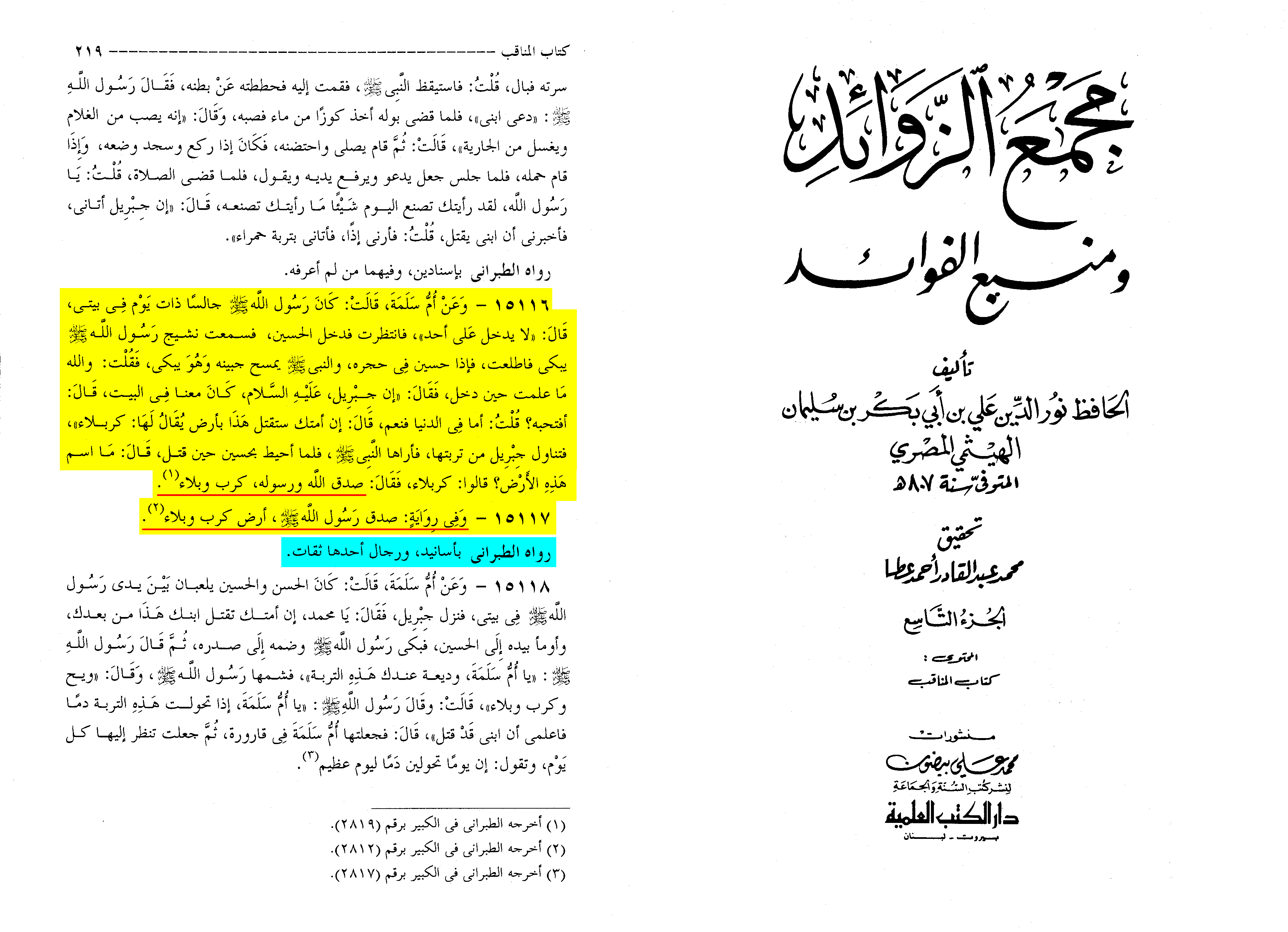كَانَ رَسُولُ اللهِ جَالِساً ذَاتَ يَوْمٍ فِي بَيْتِي، فَقَالَ : لا يَدْخُلْ عَلَيَّ أَحَدٌ، فَانْتَظَرْتُ، فَدَخَلَ الْحُسَيْنُ ، فَسَمِعْتُ نَشِيجَ رَسُولِ اللهِ يَبْكِي ، فَاطَّلَعْتُ فَإِذَا الْحُسَيْنُ فِي حِجْرِهِ، أَوْ إِلَى جَنْبِهِ ، يَمْسَحُ رَأْسَهُ وَهُوَ يَبْكِي ، فَقُلْتُ : وَاللهِ مَا عَلِمْتُهُ حِينَ دَخَلَ، فَقَالَ رَسُولُ اللَّهِ : «إِنَّ جِبْرِيلَ كَانَ فِي الْبَيْتِ، فَقَالَ : أَتُحِبُّهُ؟ قُلْتُ : أَمَّا فِي الدُّنْيَا فَنَعَمْ، قَالَ : إِنَّ أُمَّتَكَ سَتَقْتُلُ هَذَا بِأَرْضِ يُقَالُ لَهَا كَرْبَلاءُ ، فَتَنَاوَلَ جِبْرِيلُ مِنْ تُرْبَتِهَا فَأَرَاهُ النَّبِيَّ ، فَلَمَّا أُحِيطَ بِالْحُسَيْنِ حِينَ قُتِلَ ، قَالَ : مَا اسْمُ هَذِهِ الْأَرْضِ؟ قَالُوا : كَرْبَلاءُ، قَالَ : صَدَقَ رَسُولُ اللَّهِ ، أَرْضُ كَرِبٍ وَبَلاء.