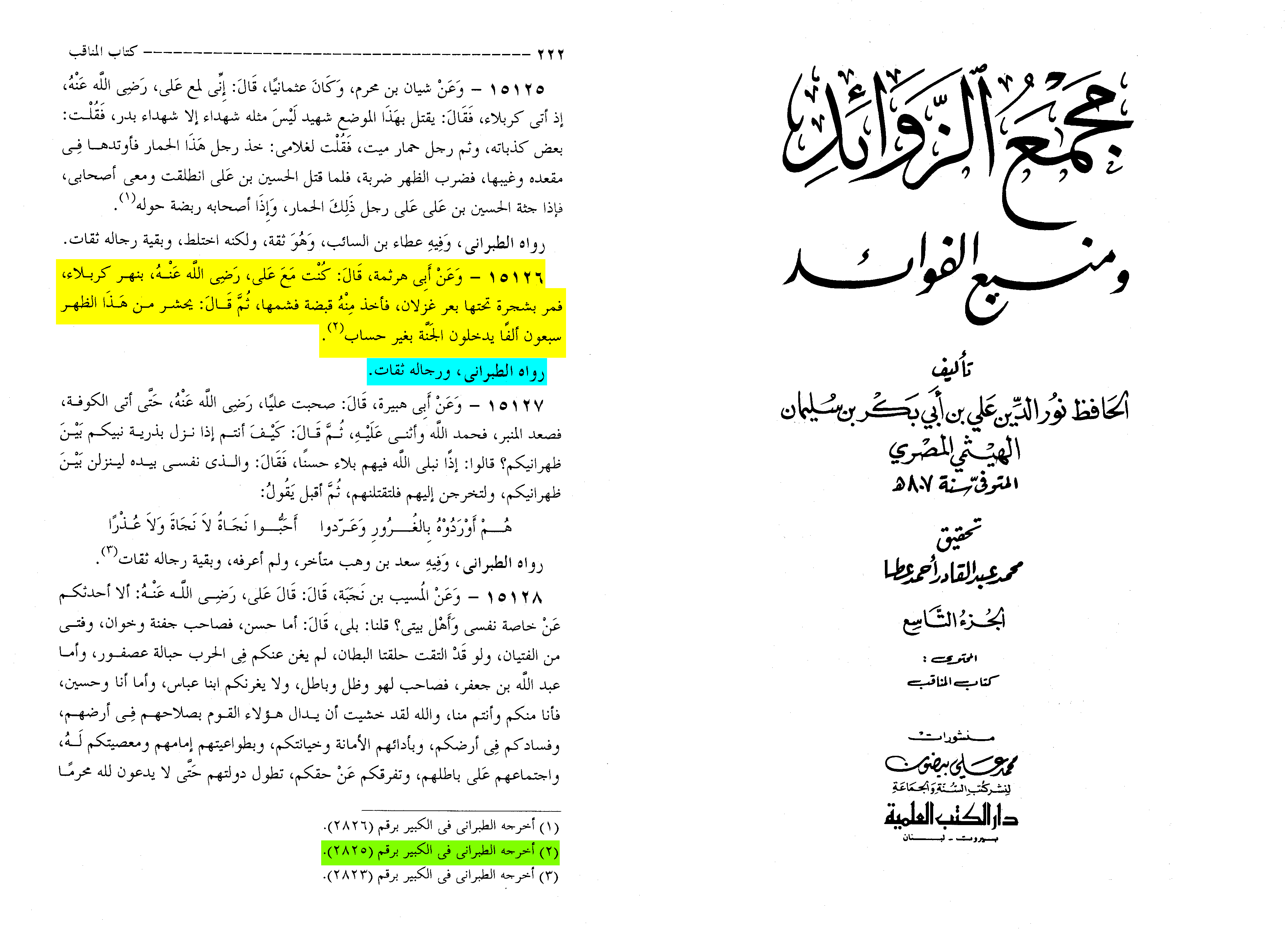 I was with ʿAlī (may Allah be pleased with him) at the banks of Karbalāʾ. He passed by a tree beneath which were droppings of gazelles. He took a handful of it, smelled it, and then said: “Seventy thousand people will be raised from this land. They will enter heaven without their actions of this world being accounted”.
