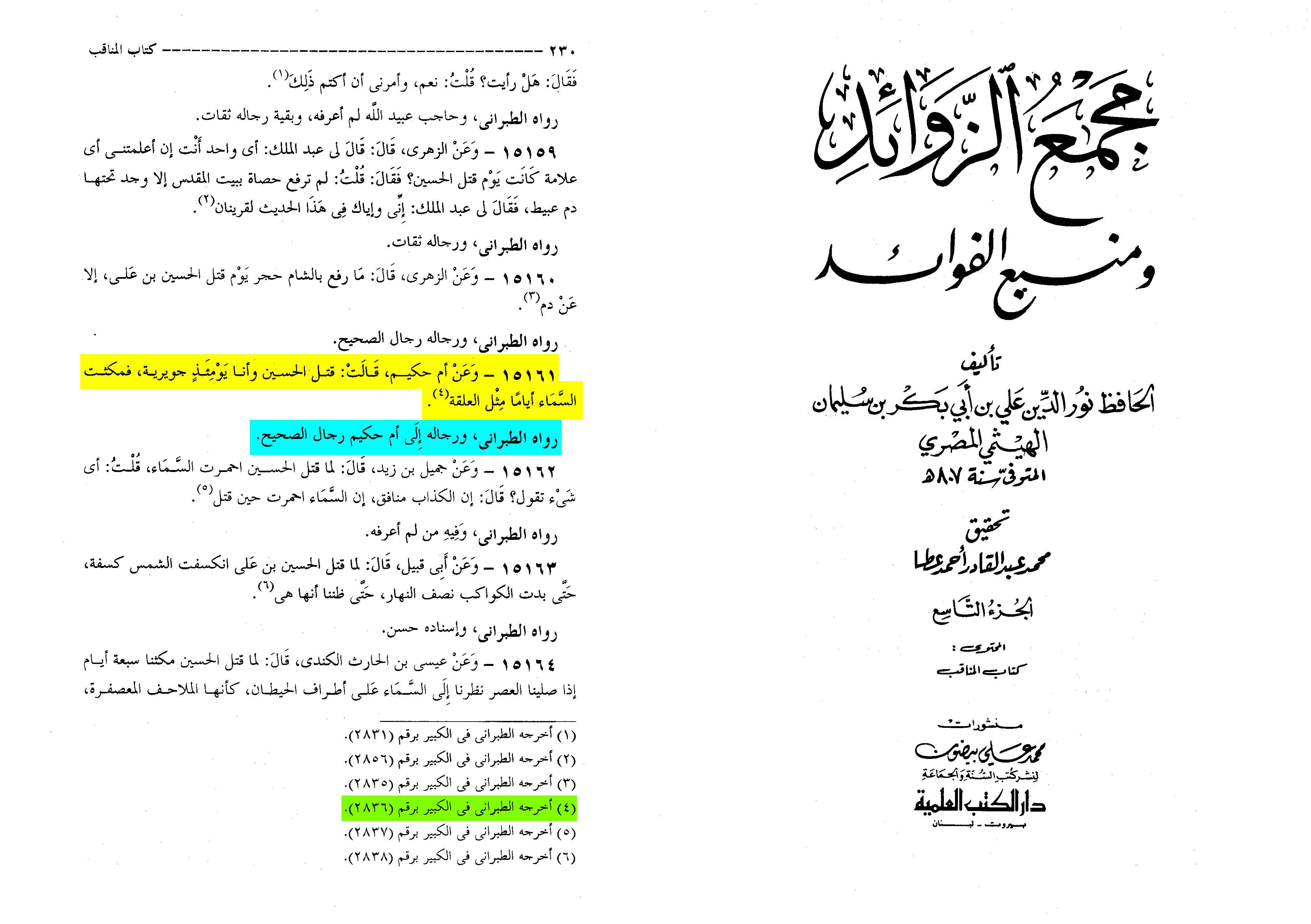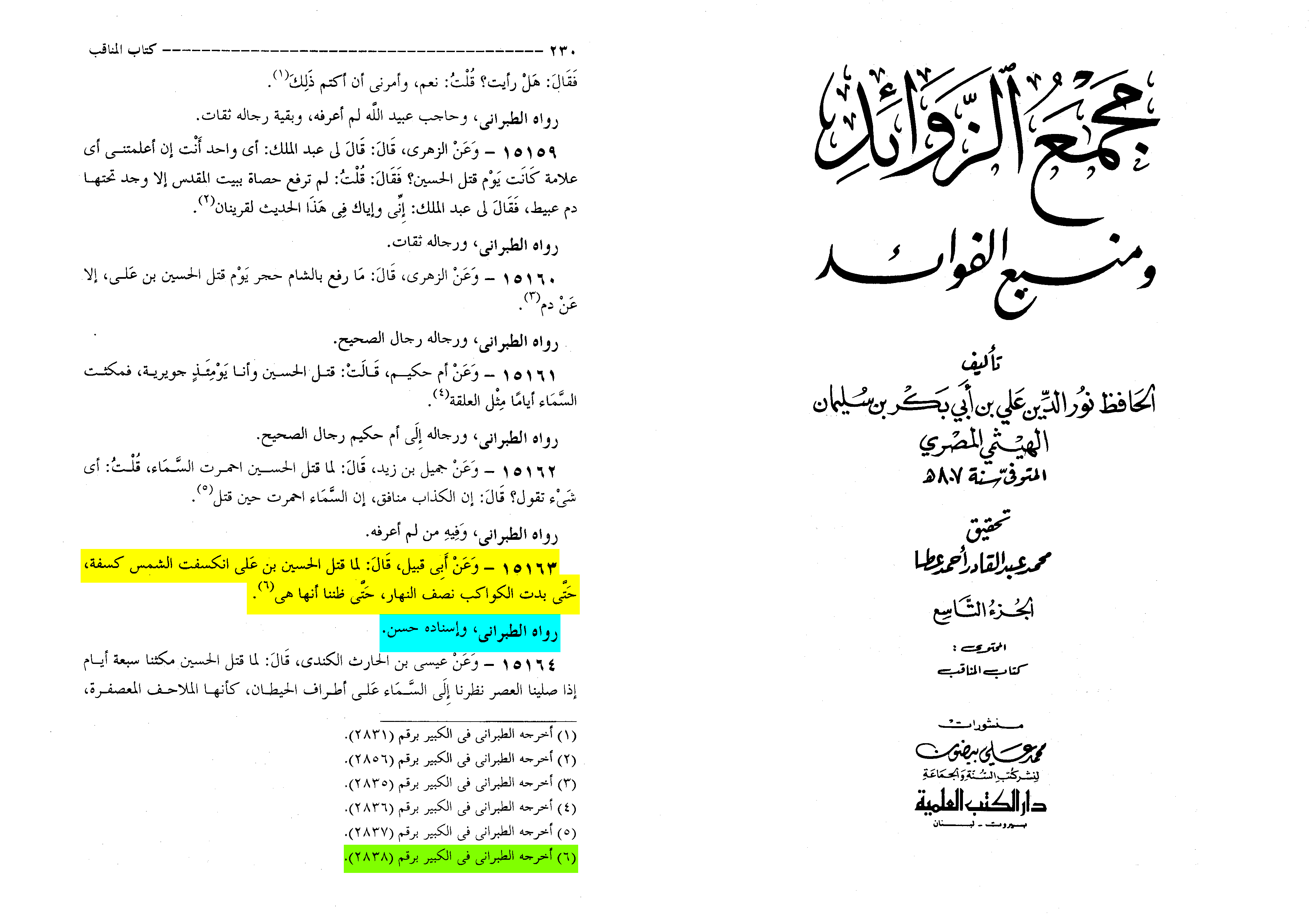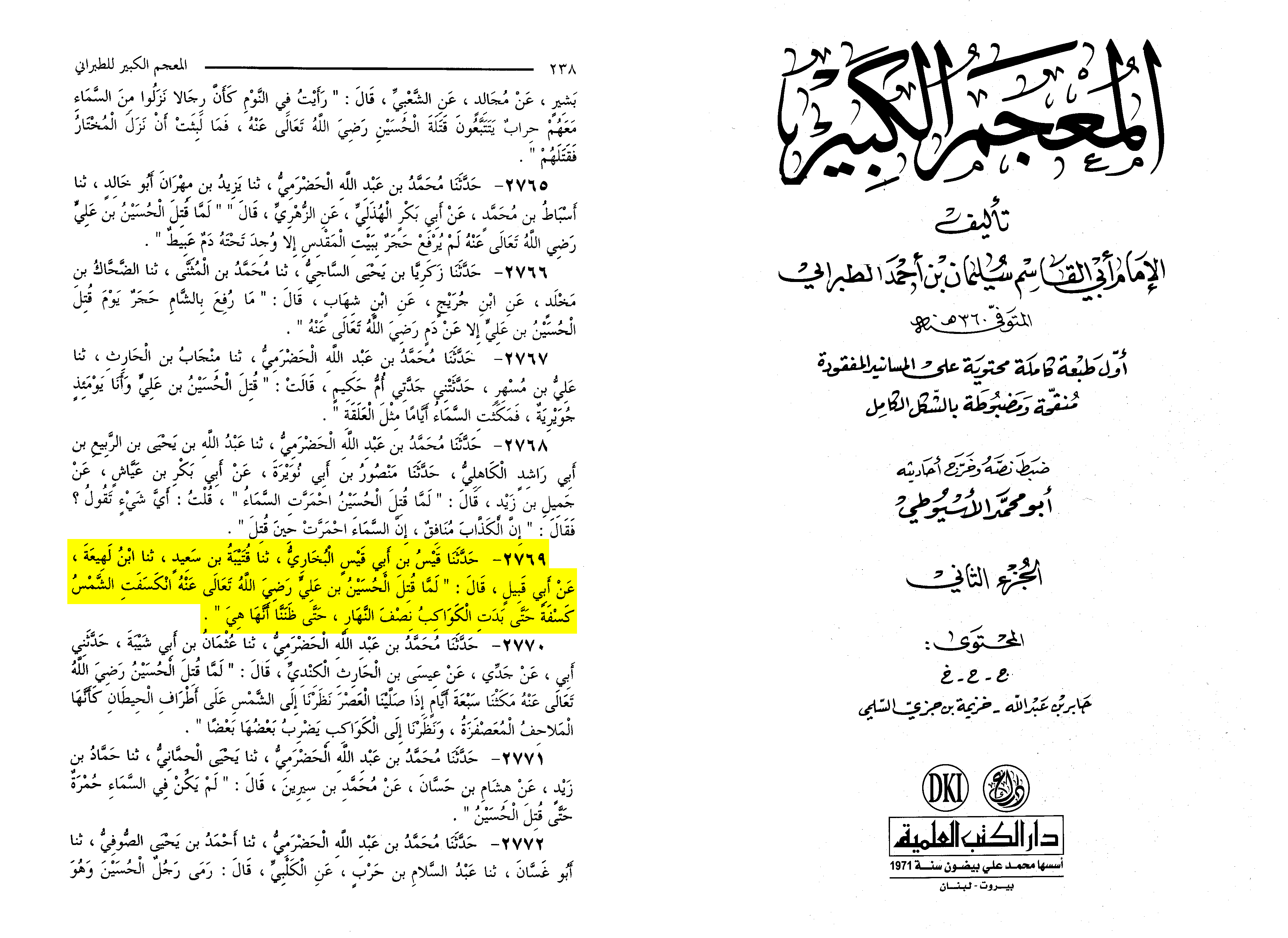 There was a solar eclipse that lasted three days, after which the sky became filled with so many stars (that they were almost colliding with one another). On the next day, we were grief-stricken about the killing of Ḥusain. Shortly thereafter, we learned the disastrous news of the killing of Ḥusain.