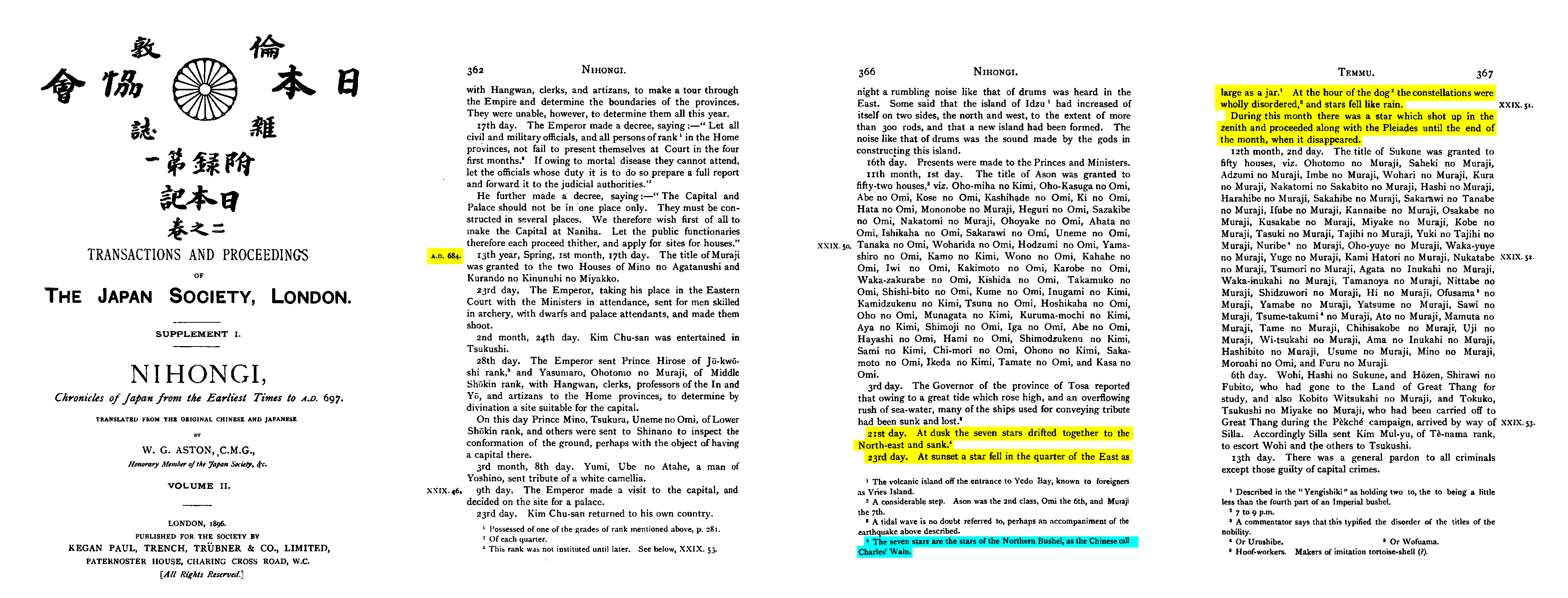 The authors, under the instructions of the Emperor of Japan, Tenmu (d. 686 CE), wrote down strange activities that partook in the skies close to the date of the killing of al-Husayn (AS), similar to the timeline in the Anglo Saxon chronicles (~65 AH).
