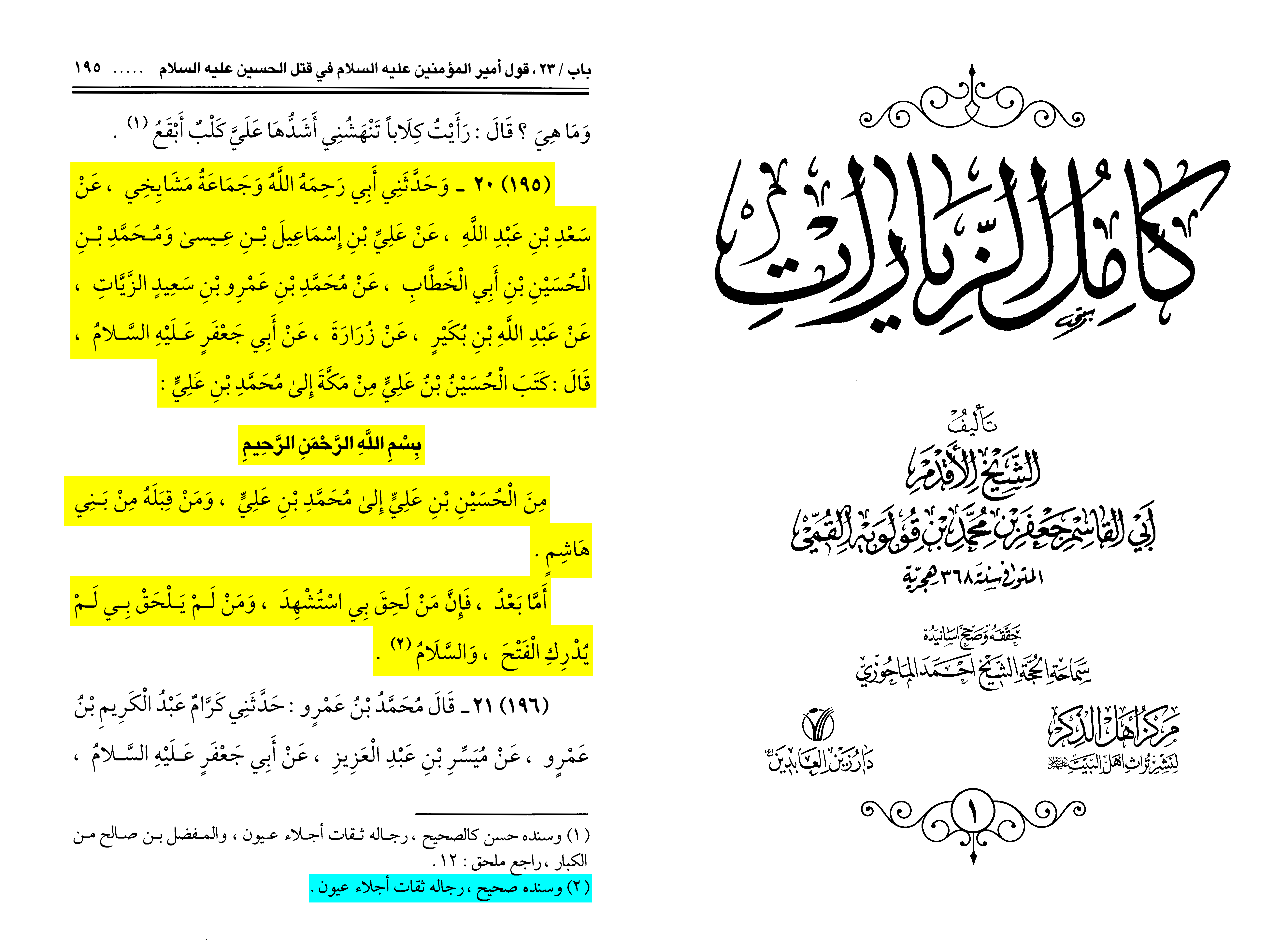 Imam al-Husayn (as) sends a letter to Muhammad b. al-Hanafiyah (his brother) as recorded in Kamil al-Ziyarat pg. 195 Hadith # 195:
