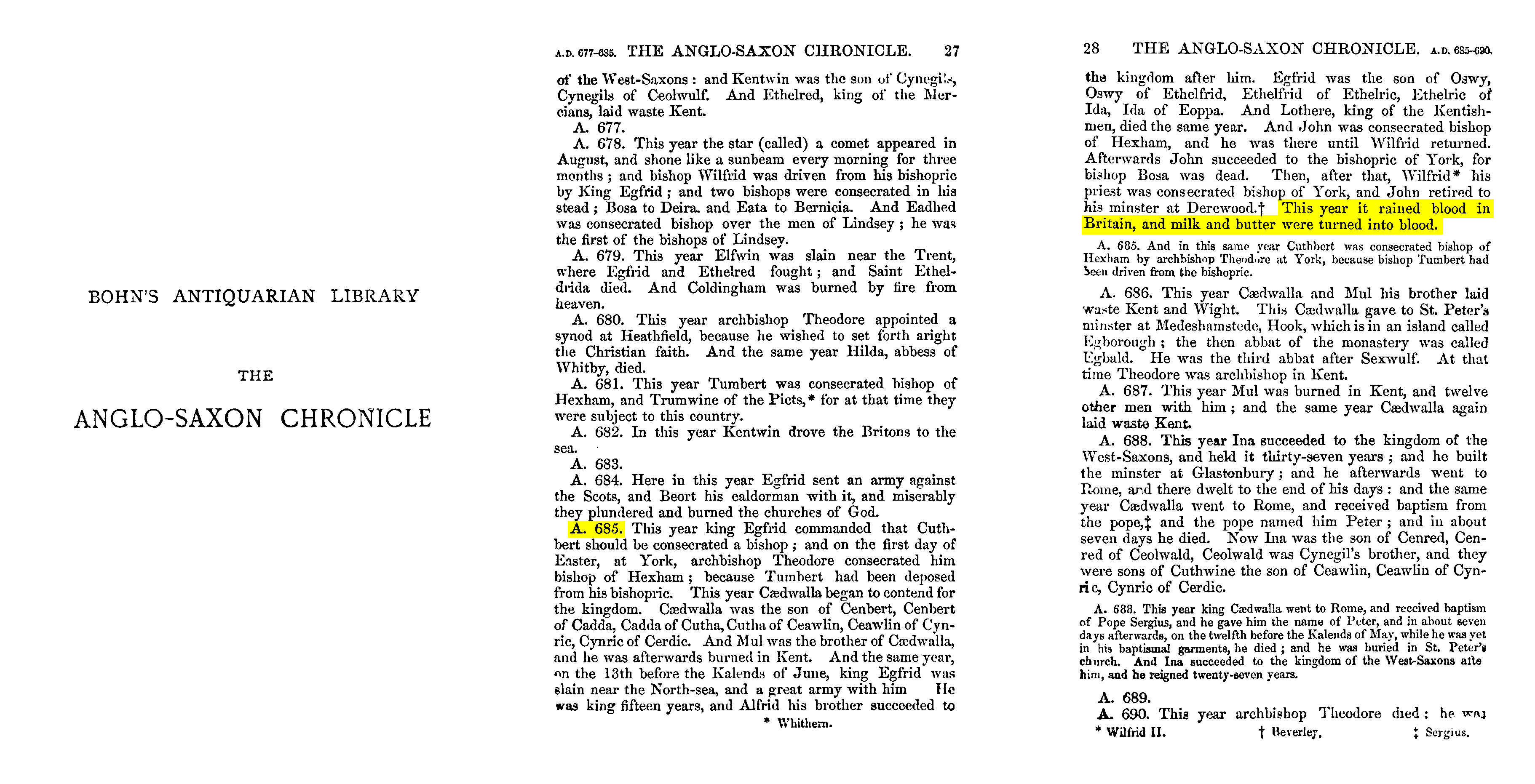 In the year 685 (65-66 AH): Here in Britain there was Bloody rain, and milk and butter were turned to blood.