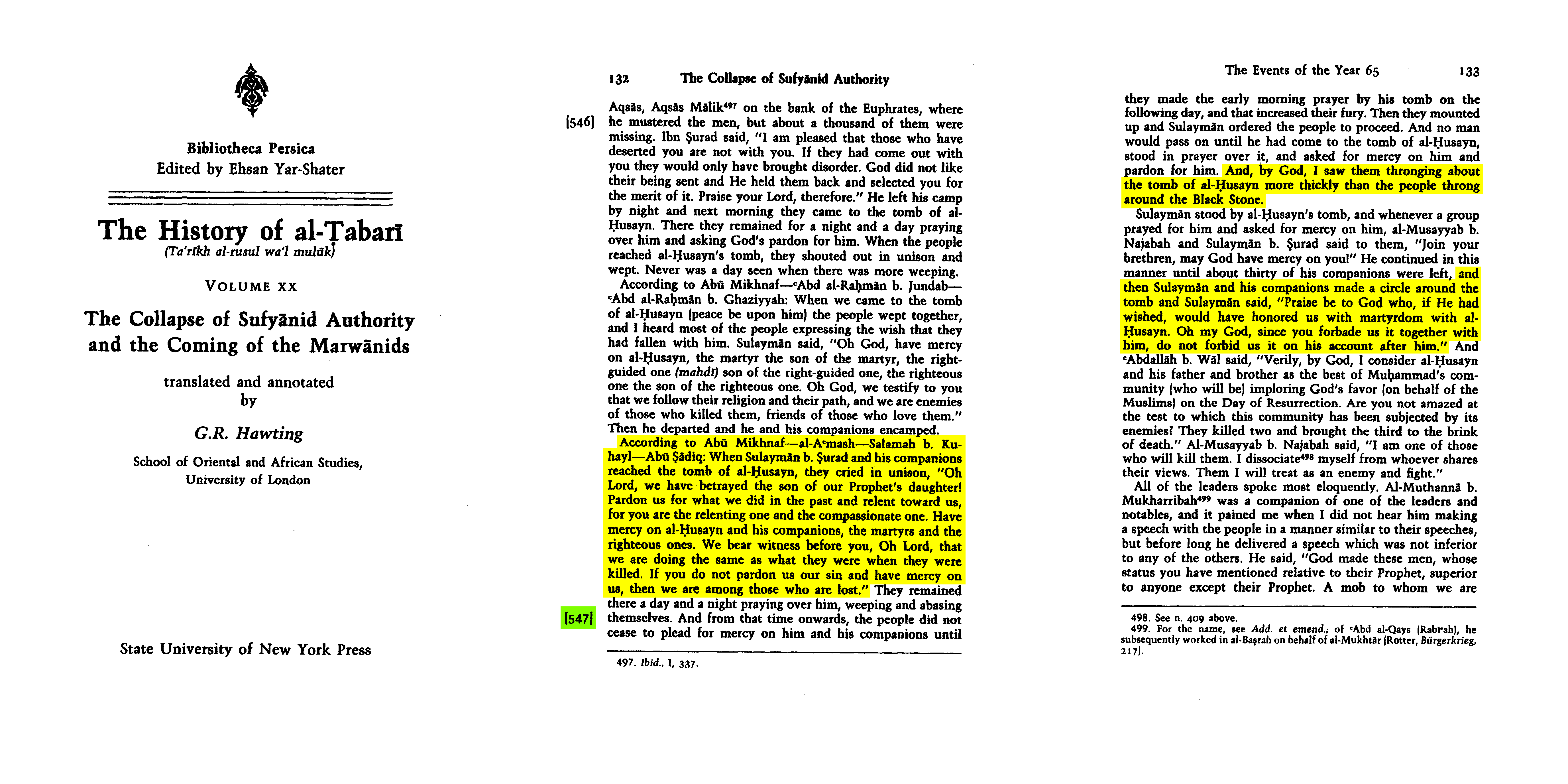 When Sulayman b. Surad and his companions reached the tomb of al Husayn, they cried in unison, "Oh Lord, we have betrayed the son of our Prophet's daughter! Pardon us for what we did in the past and relent toward us, for you are the relenting one and the compassionate one. Have mercy on al Husayn and his companions, the martyrs and the righteous ones. We bear witness before you, Oh Lord, that we are doing the same as what they were when they were killed. If you do not pardon us our sin and have mercy on us, then we are among those who are lost."