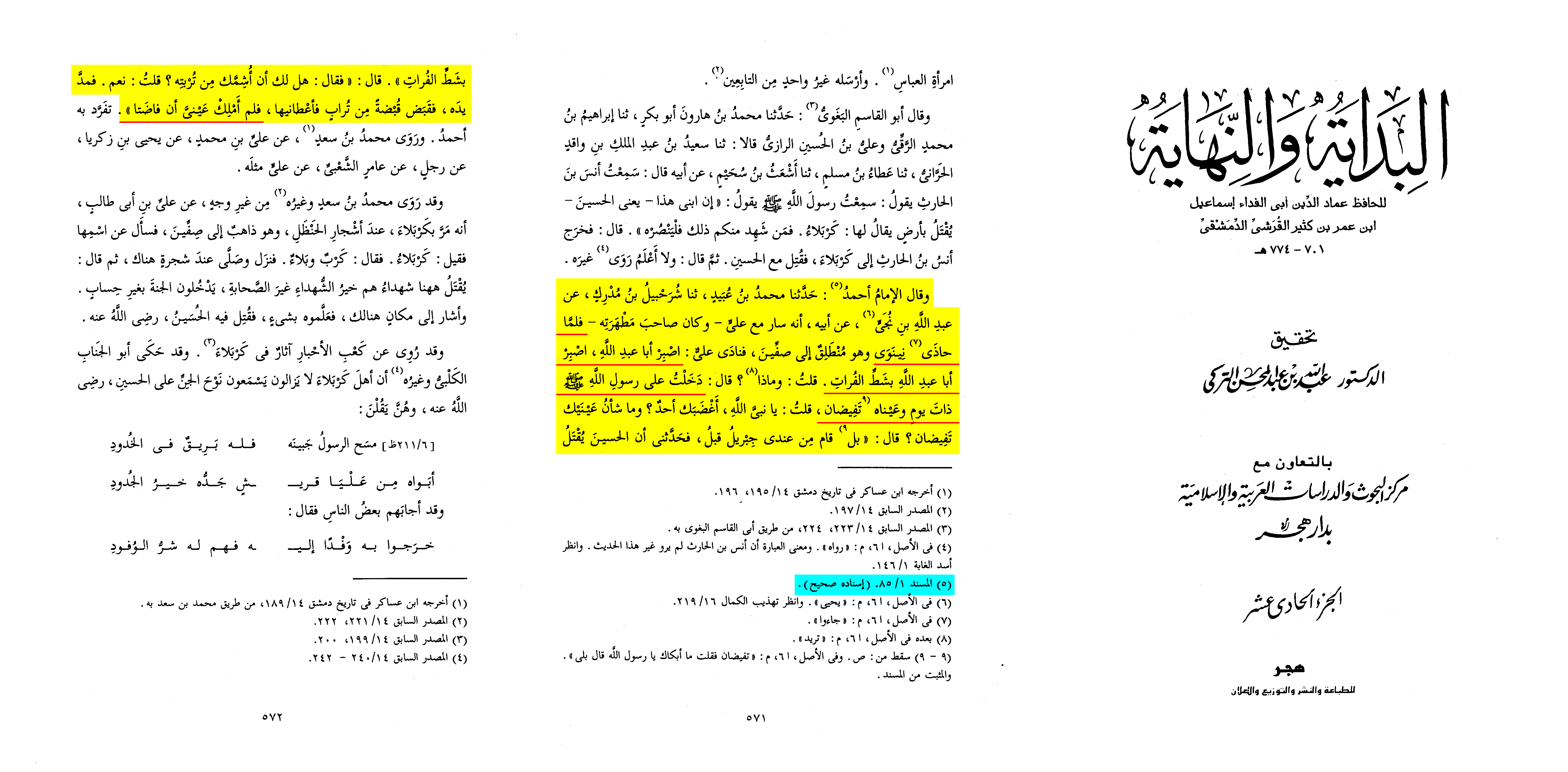 I replied: ‘Yes, in this world I do.’ He said: ‘Indeed, your community will kill him in a land called Karbala.’ Then Jibril took from its soil and showed it to the Prophet.”