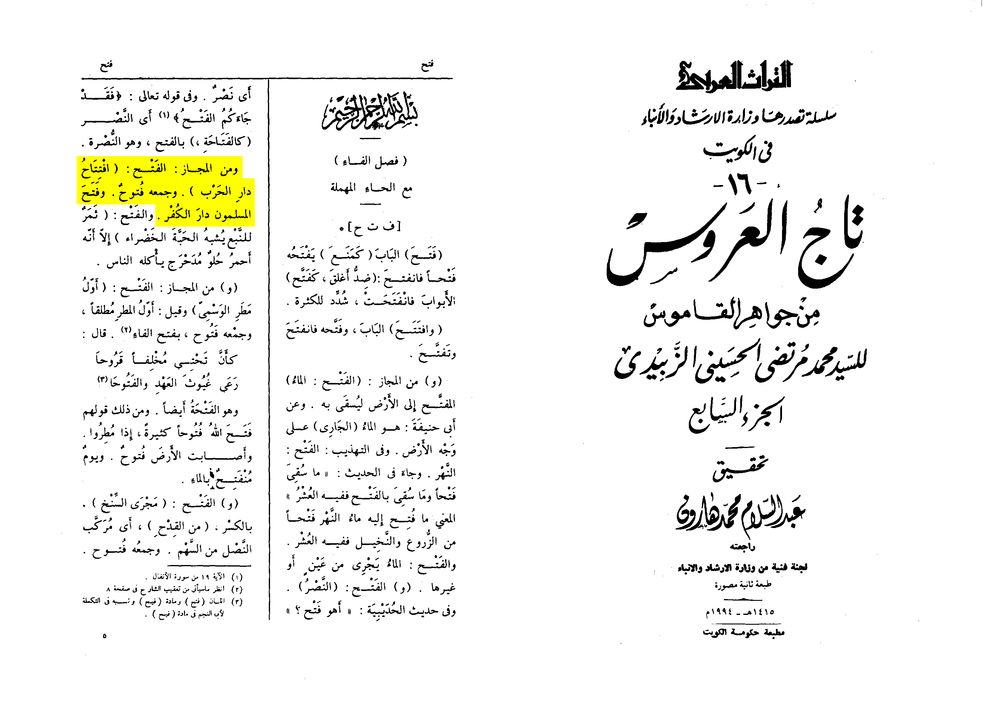 Figuratively, al-fatḥ can mean the opening of an enemy territory. Its plural is futūḥ. One says: “The Muslims fataḥū (conquered) the land of disbelief.”